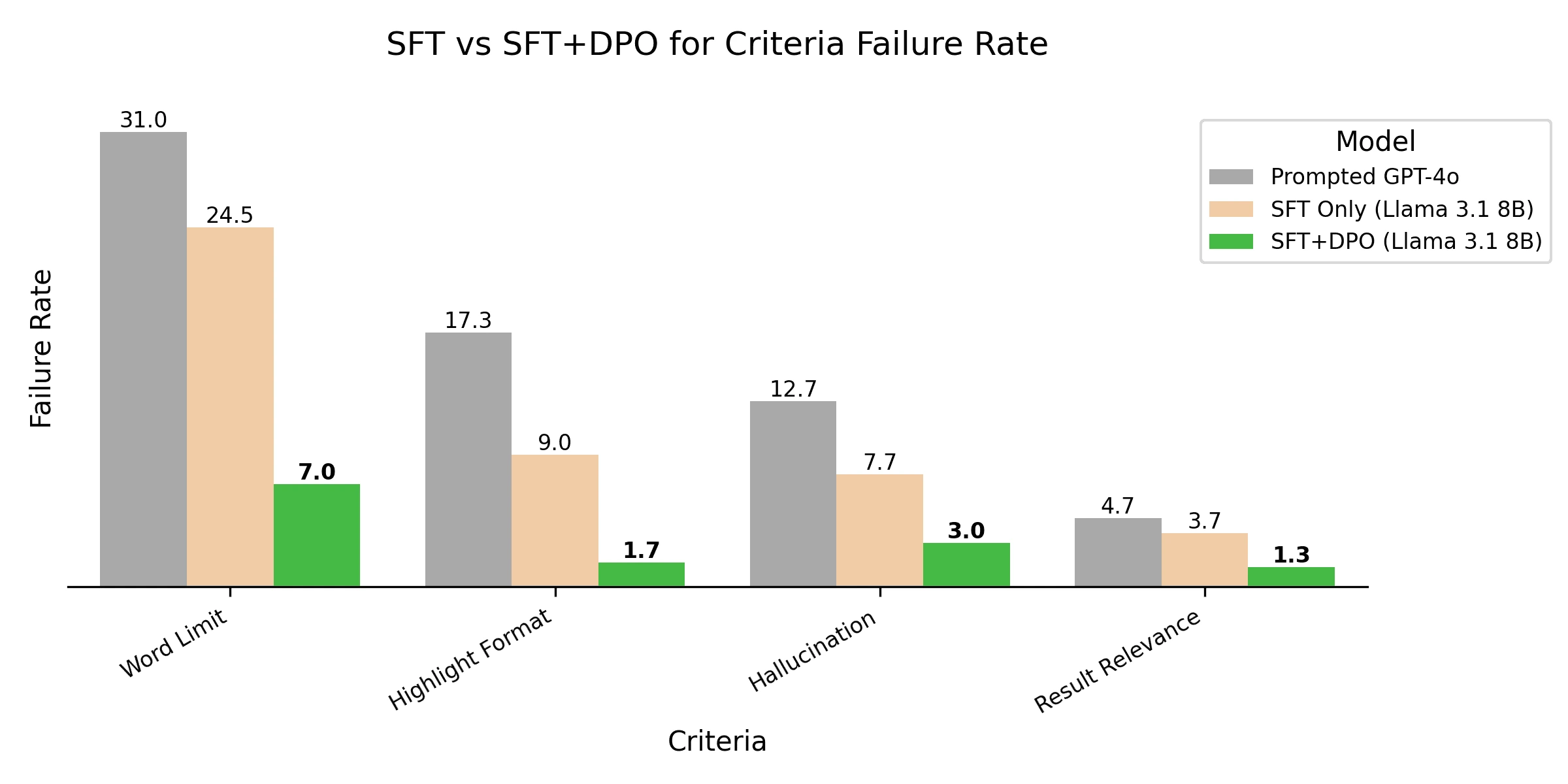 Highlight Format: for a content formatting task, DPO was able to drop the percentage of times the wrong word or phrase was highlighted from 17.3% to 1.7%, a 90% decrease.