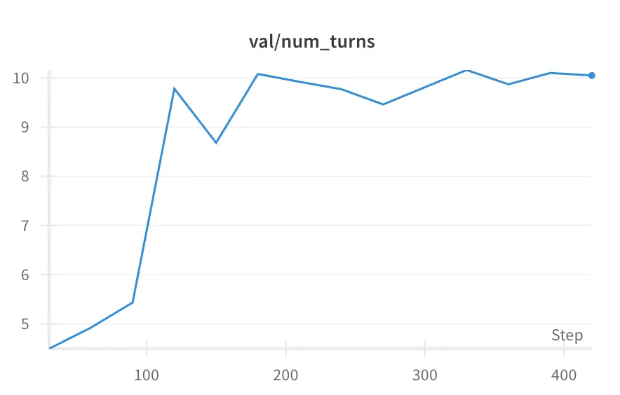 completion_tokens: int = 0- Look at actual model outputs. Your RL model is sneaky and always trying to reward hack. Even if your reward is increasing, you need to look at actual outputs regularly to make sure it’s really doing what you want.2 On one early run, we decided to give a small “partial credit” bonus for taking more turns to encourage exploration. The model learned to just repeat the last tool call over and over until it hit the maximum number of turns!