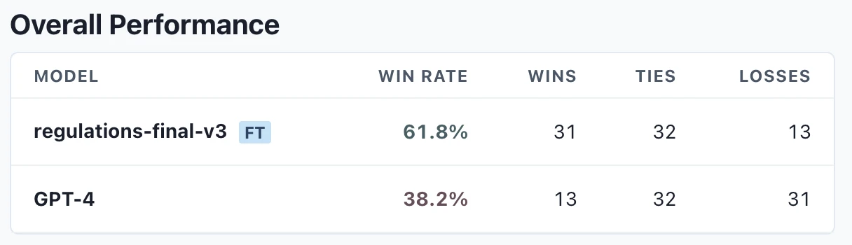 At this point, Axis has deployed multiple fine-tuned models in production and is using them to power all customer traffic. Their models are able to process events and regulations in many languages effectively, and actually in some cases outperform GPT-4, despite being a fraction of the cost. As their user growth continues, these models and the feedback they get on their generations will also help them build a data flywheel that will cement their position as the market leader. “OpenPipe proved to be a great partner for us,” Mishaal writes. We feel the same way!