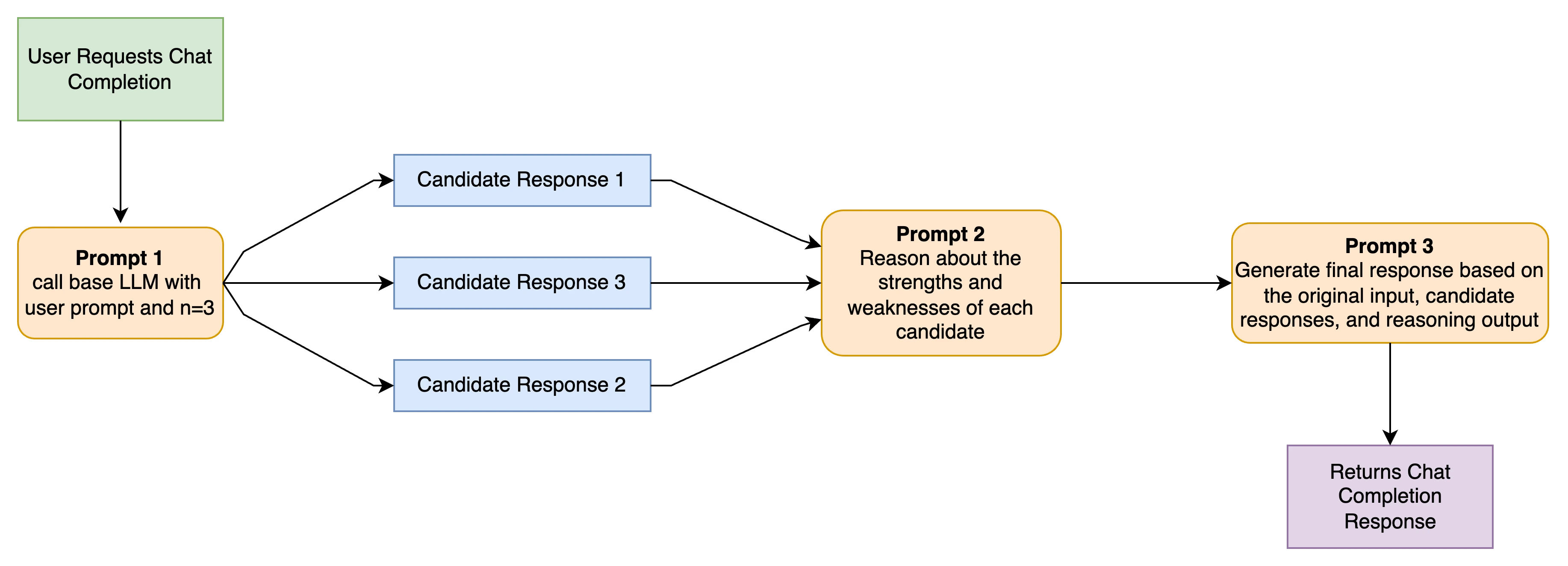Prompt 1 generates 3 candidate completions in parallel by calling the chosen base model with