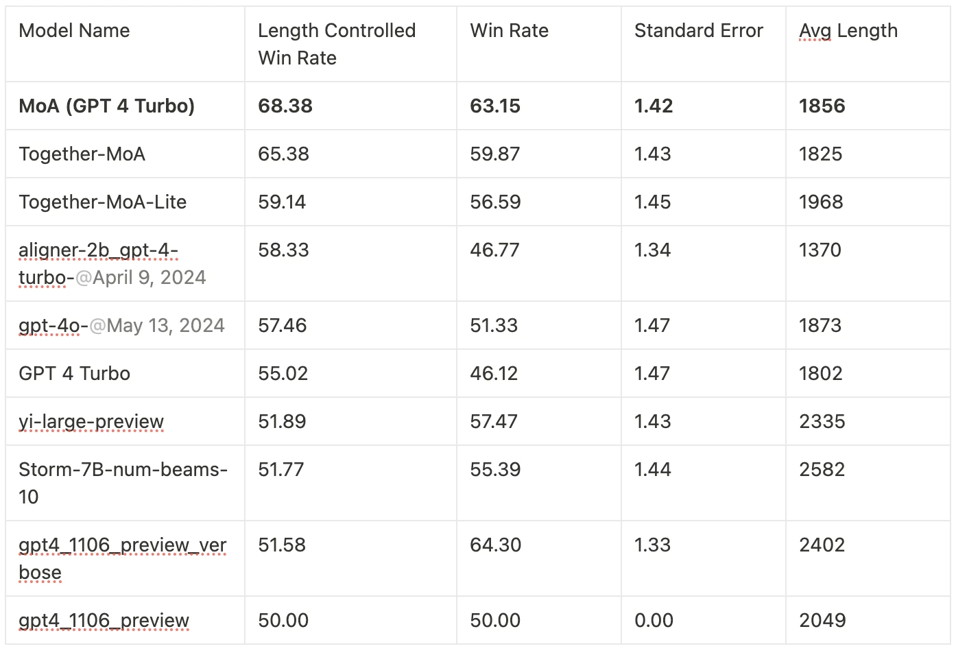 AlpacaEval 2.0 includes 805 challenging prompts with a judge method that debiases results using length-controlled win rates, showing a Spearman correlation of 0.98 with Chatbot Arena. Our model outperformed all other models, including the recently released Together MoA model.