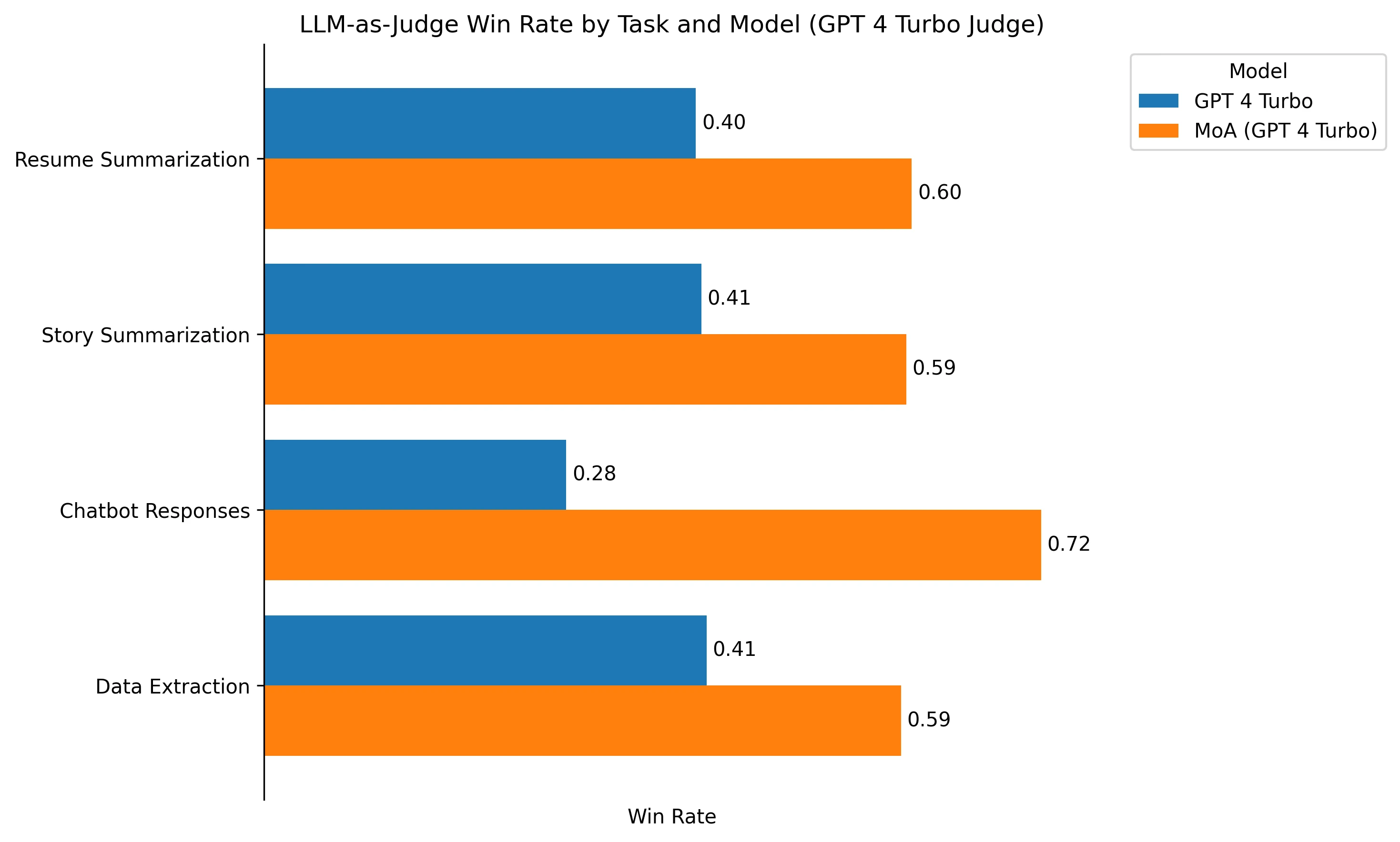 We selected four tasks representing common categories on our platform: Summarization, Chat, and Data Extraction. With customer permission, we chose 200 random samples from each task to create our internal benchmark. Using our custom LLM-as-judge evaluations, calibrated through user feedback, we compared GPT-4-Turbo against our MoA model. Tests were run with both GPT-4-Turbo and Claude as the LLM judge. Our MoA model showed a 19.25% improvement over GPT-4-Turbo.