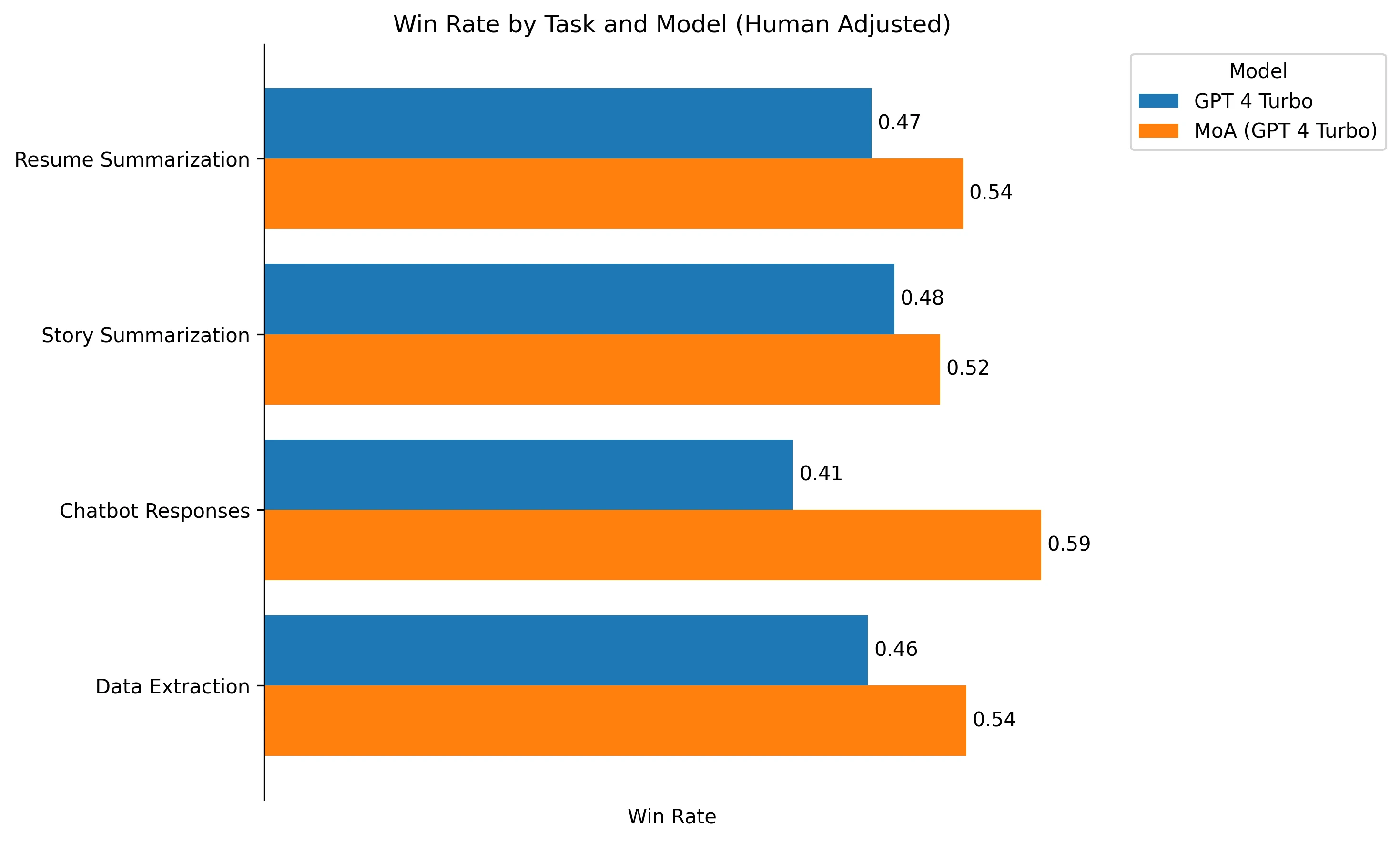 We acknowledge that LLM-as-judge alone is not a sufficient measure of performance. We selected a subset of 32 samples from our benchmark, evenly split between samples where the LLM judge preferred MoA and those where it preferred GPT-4-Turbo. We manually collected preference data on this subset from four highly trained human raters. Using this data, we adjusted the win rates of the LLM judge to more accurately reflect human judgment. Although the adjustments decreased the degree to which MoA outperforms GPT-4-Turbo, the adjusted win rates still showed that MoA models were stronger than the base models they came from by 9%.