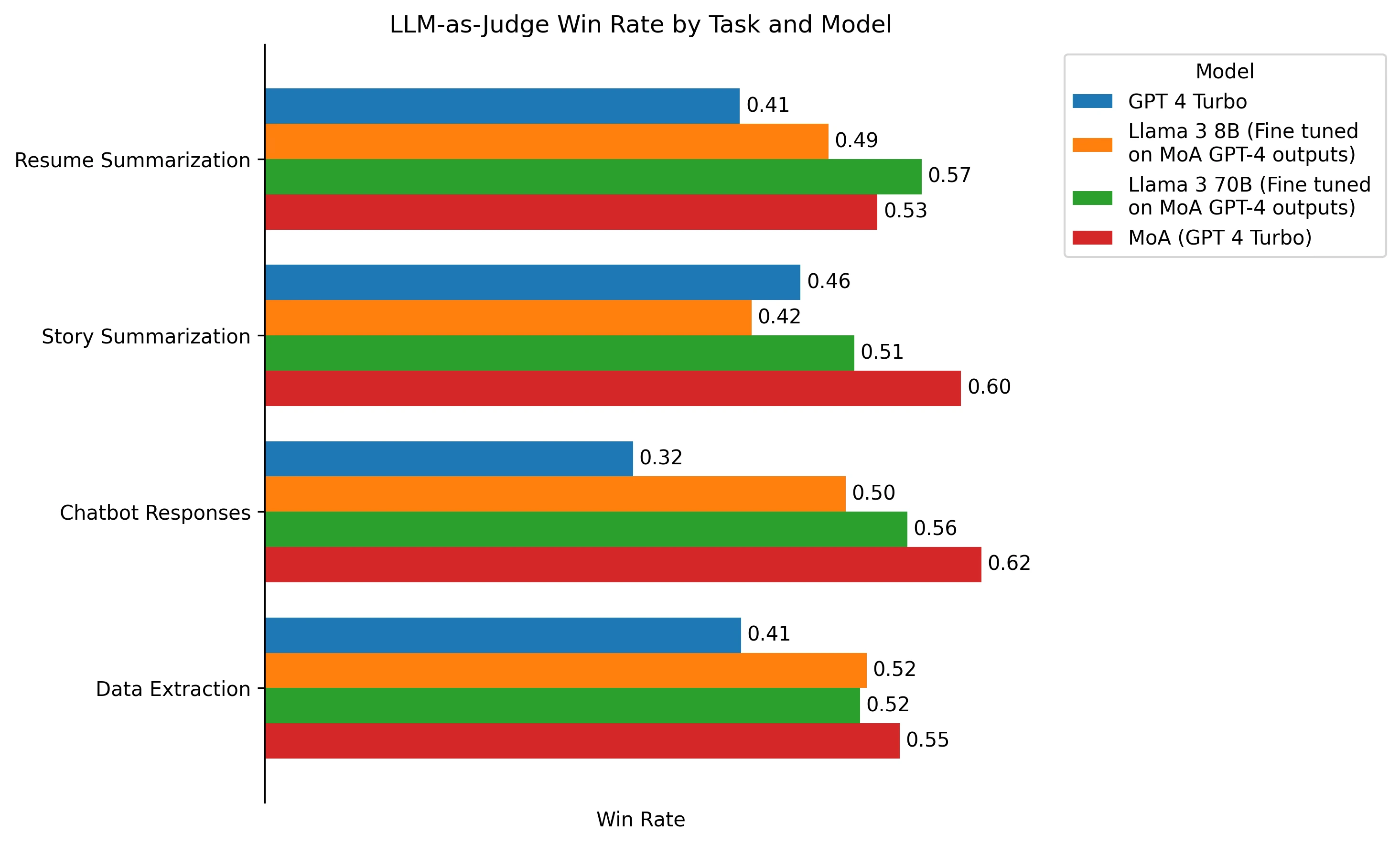 We tested exactly this pipeline across four use-cases, training both Llama 3 70B and 8B variants on each use-case. We found that while the MoA outputs still outperformed our fine-tuned models on most tasks, the fine-tuned models in turn outperformed base GPT-4. Concretely, Llama 3 70B outperformed GPT-4 on 4/4 tasks, and Llama 3 8B outperformed GPT-4 on 3/4 tasks. Importantly, Llama 3 8B is also 1/25th the cost and 1/3rd the latency of GPT-4-Turbo.