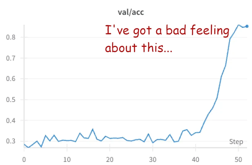 At first, the model didn’t learn much. But around step 42, it jumped from ~30% accuracy (random guessing) to almost 100%!